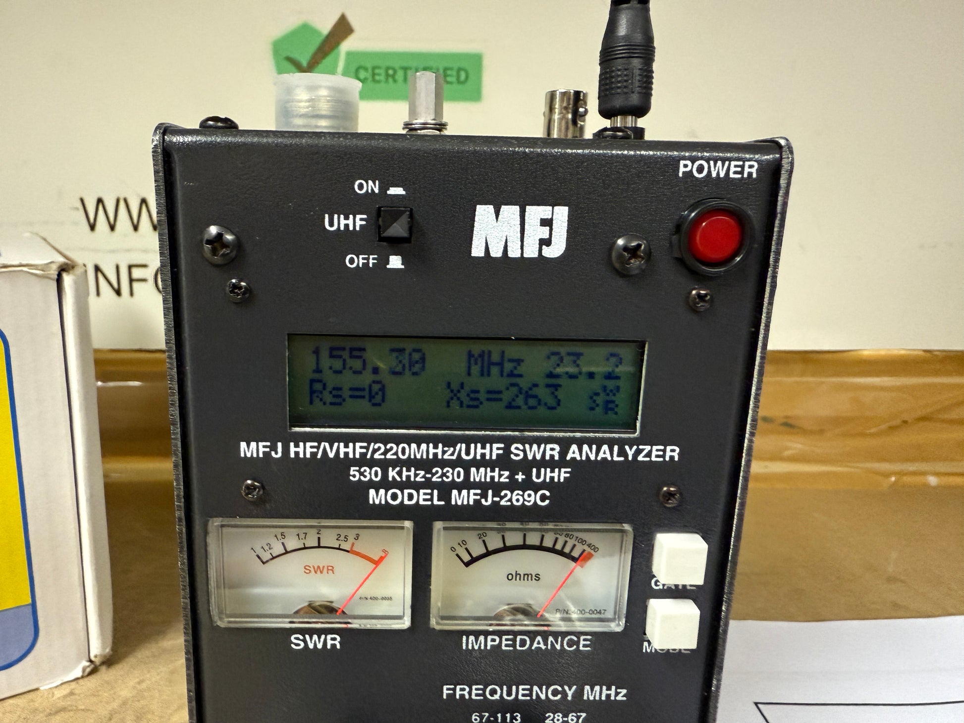 L'MFJ-269C, completamente portatile, è dotato di un circuito di carica integrato per batterie NiCad/NiMH, di un salva batteria e di un avviso di batteria scarica. È dotato di un connettore N e di un adattatore N-SO239 incluso. Dimensioni: 103 x 173 x 60 mm.