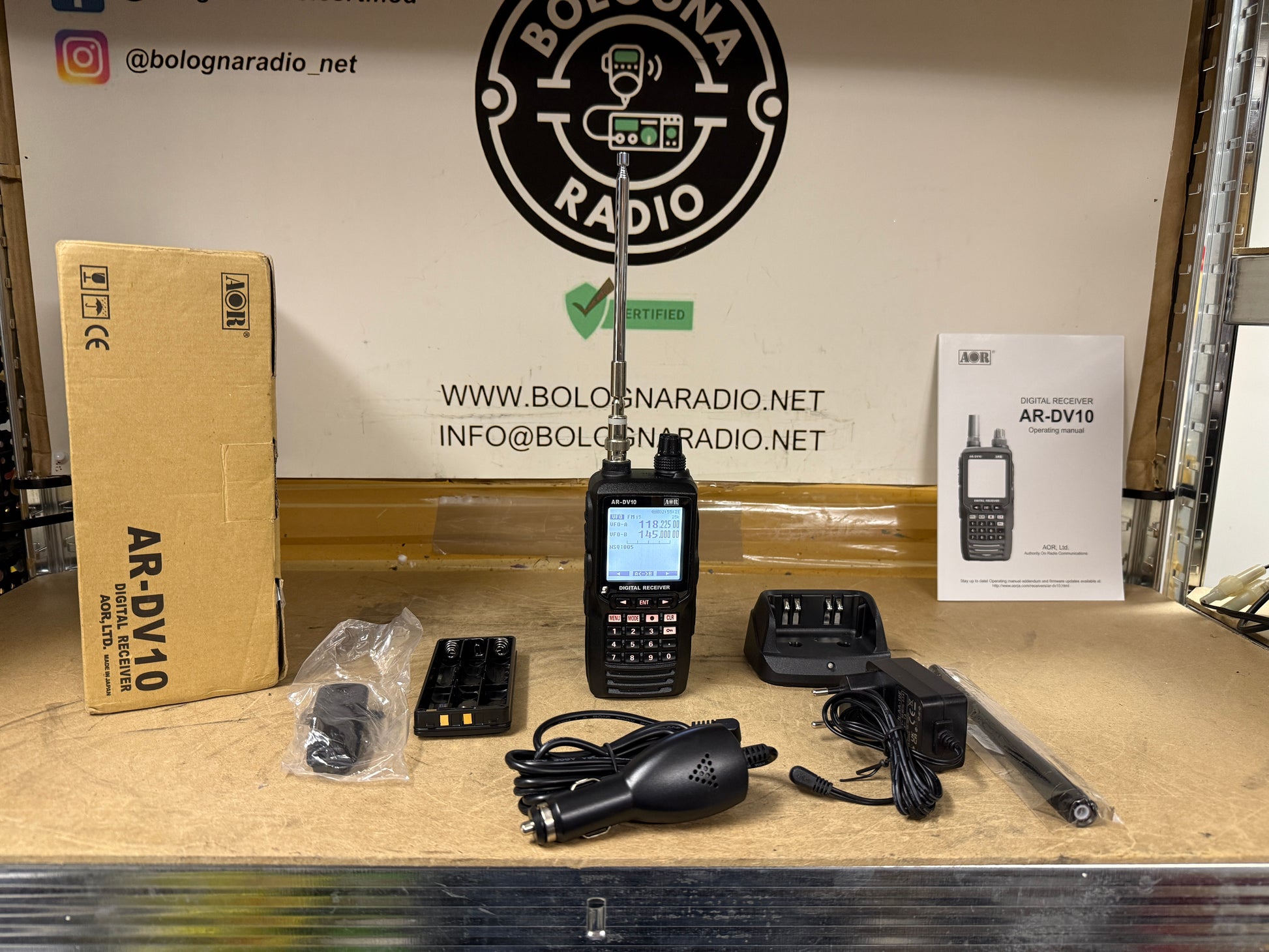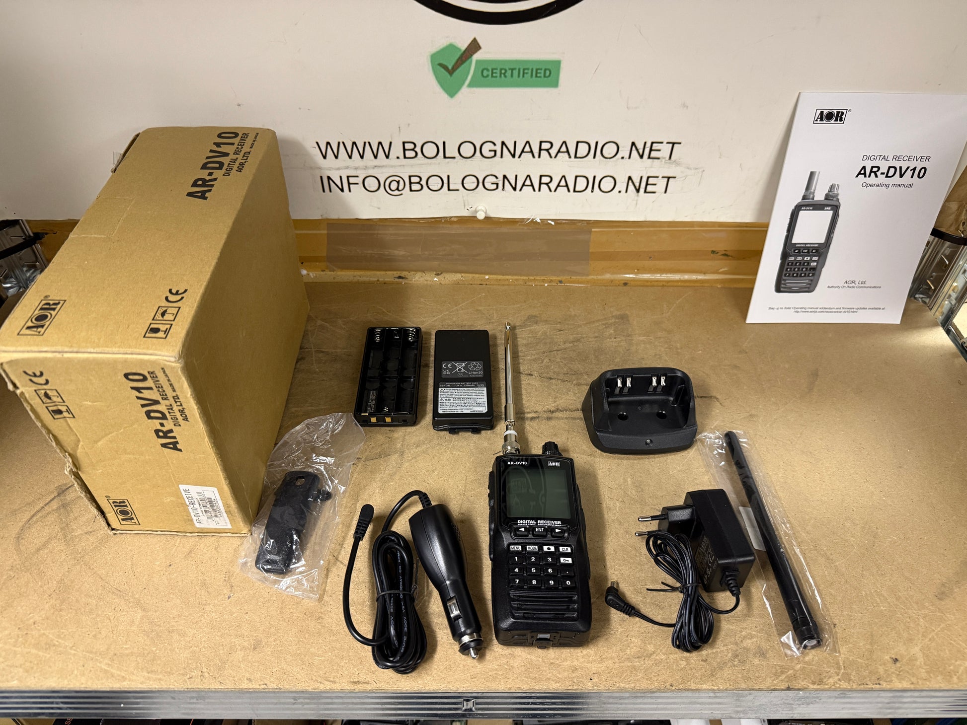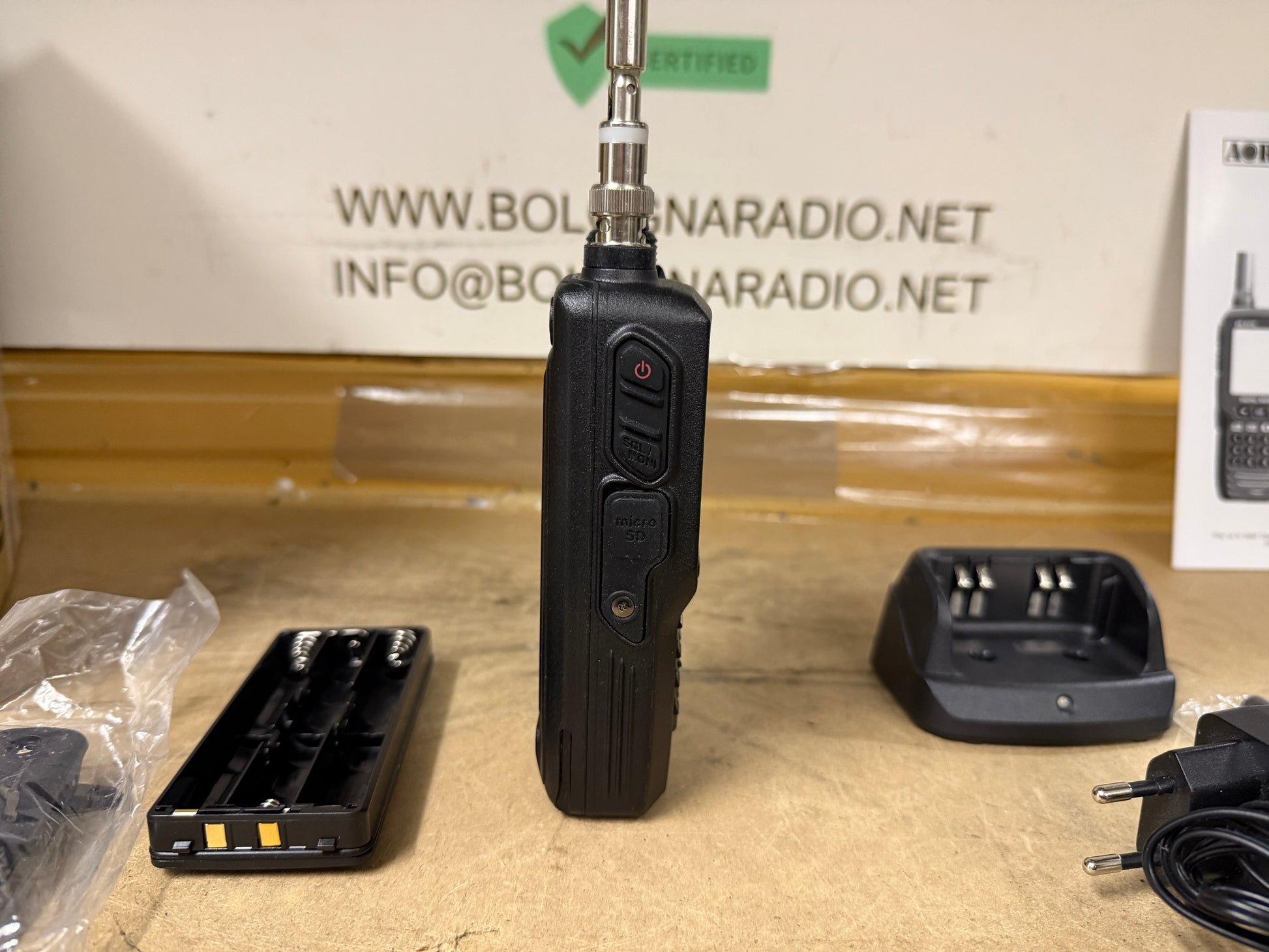 - fornito completo di: supporto di carica da tavolo con adattatore 220Vac, antenna in gomma con connettore BNC, clip, cavo alimentazione cc con spina accendisigari, portabatteria a secco (6 x AA)