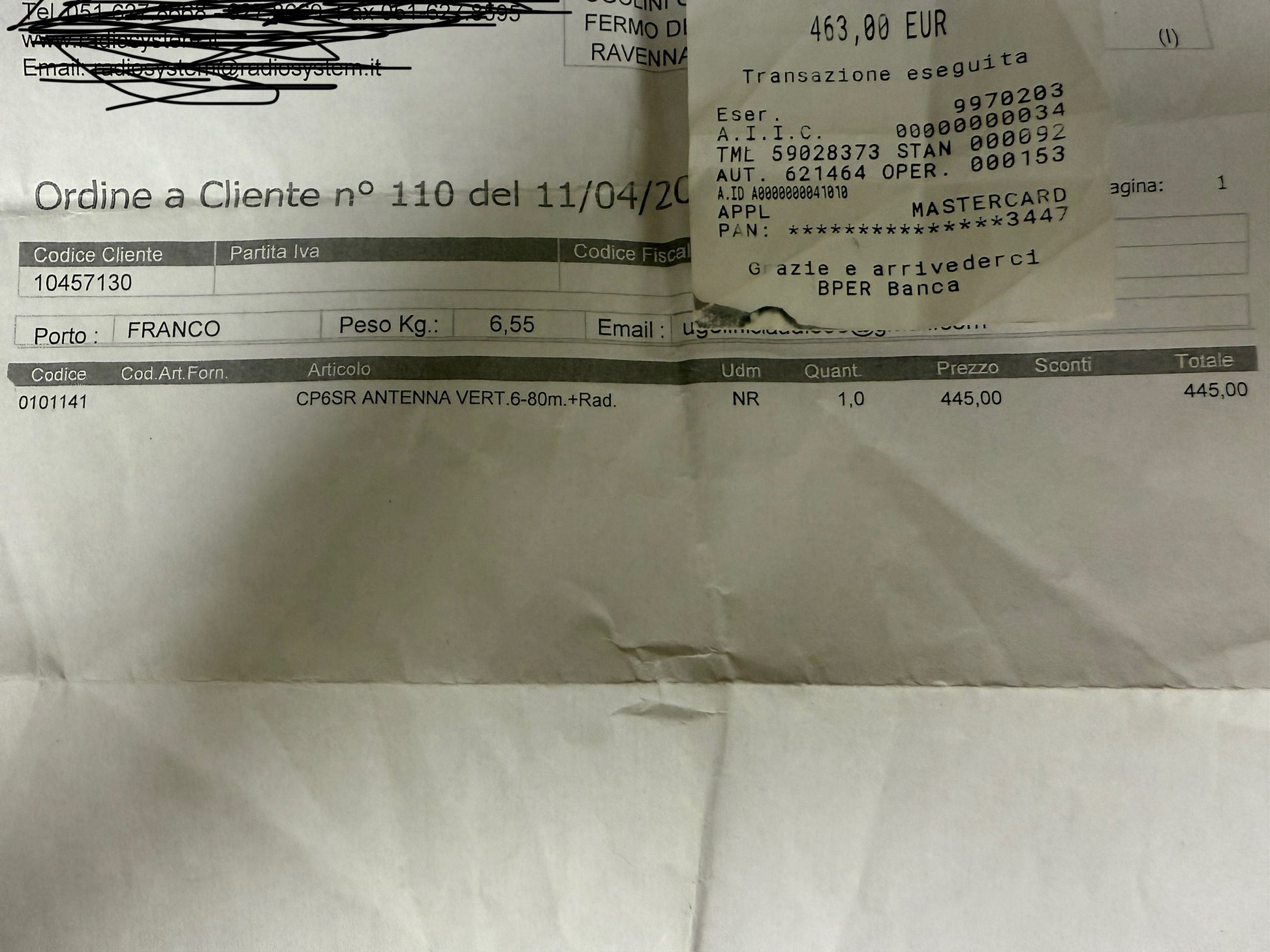 Potenza massima applicabile 200Watt in SSB, impedenza 50Ohm con ROS migliori di 1,5, altezza 4,6m autoportante,