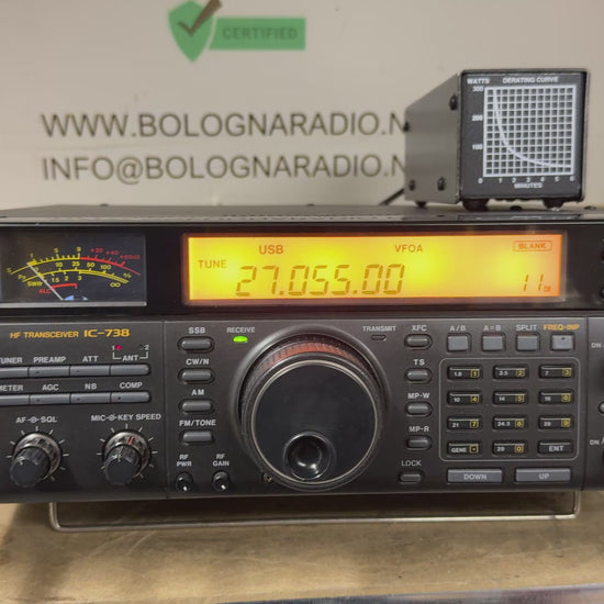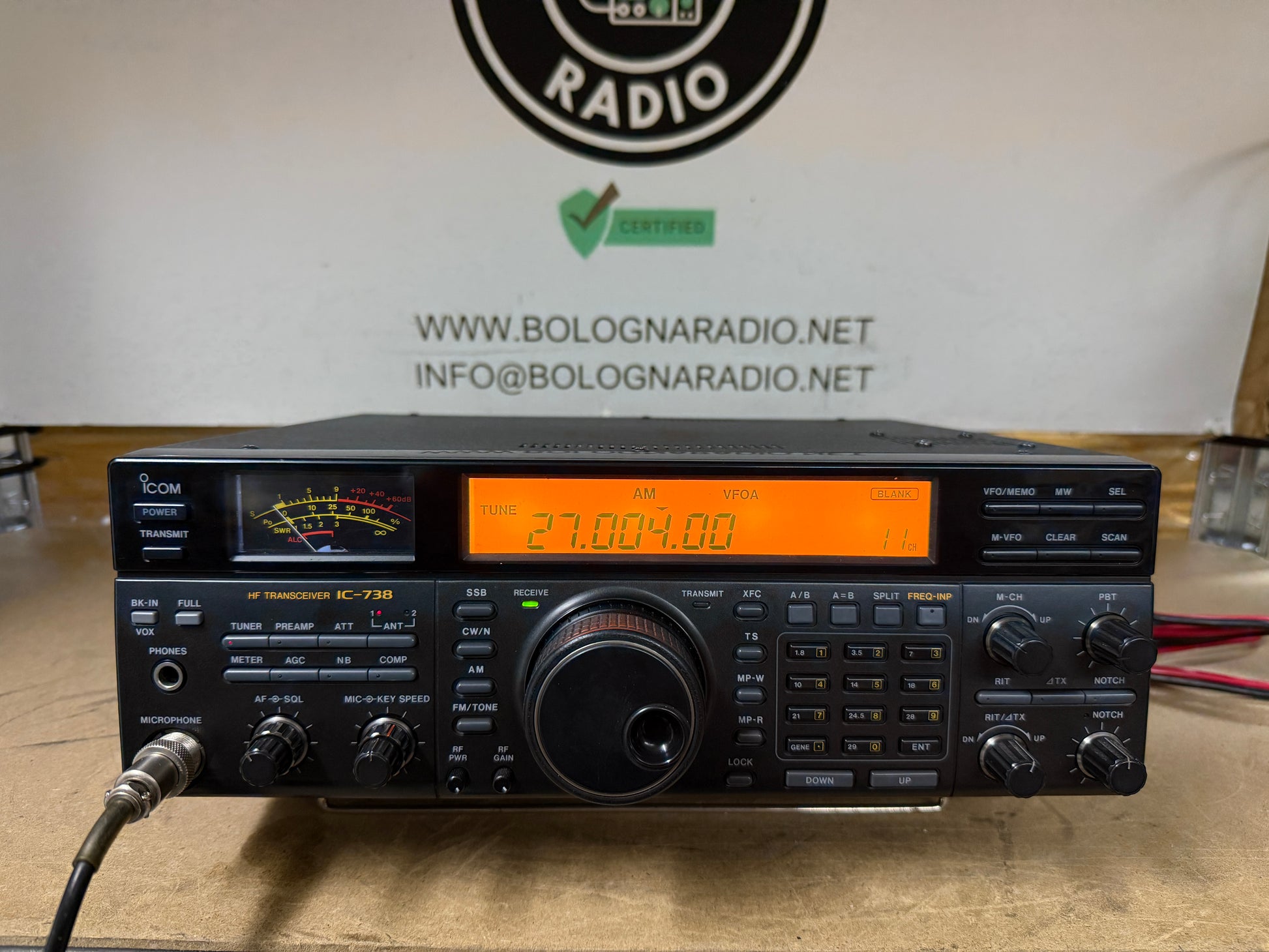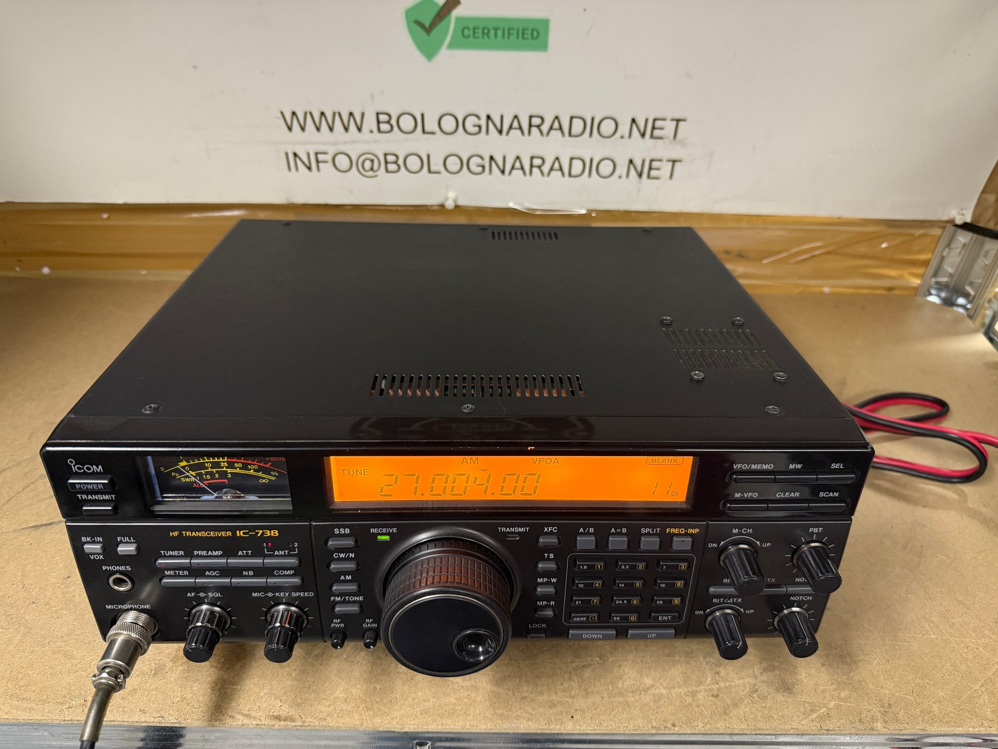 L'IC-738 è un ricetrasmettitore per modi CW/SSB/AM/FM con potenza regolabile da 5 a 100 Watt ed operativo sulle bande radioamatoriali HF con ricevitore a copertura generale tra 500 kHz e 30 MHz. Caratteristiche: preamplificatore / attenuatore RF, PBT, filtro Notch, RIT / XIT, VOX, keyer per CW, full break-in / semi break-in, compressore vocale, doppio registro che memorizza due frequenze e relativi modi per ciascuna banda, accordatore d'antenna interno, due ingressi d'antenna.