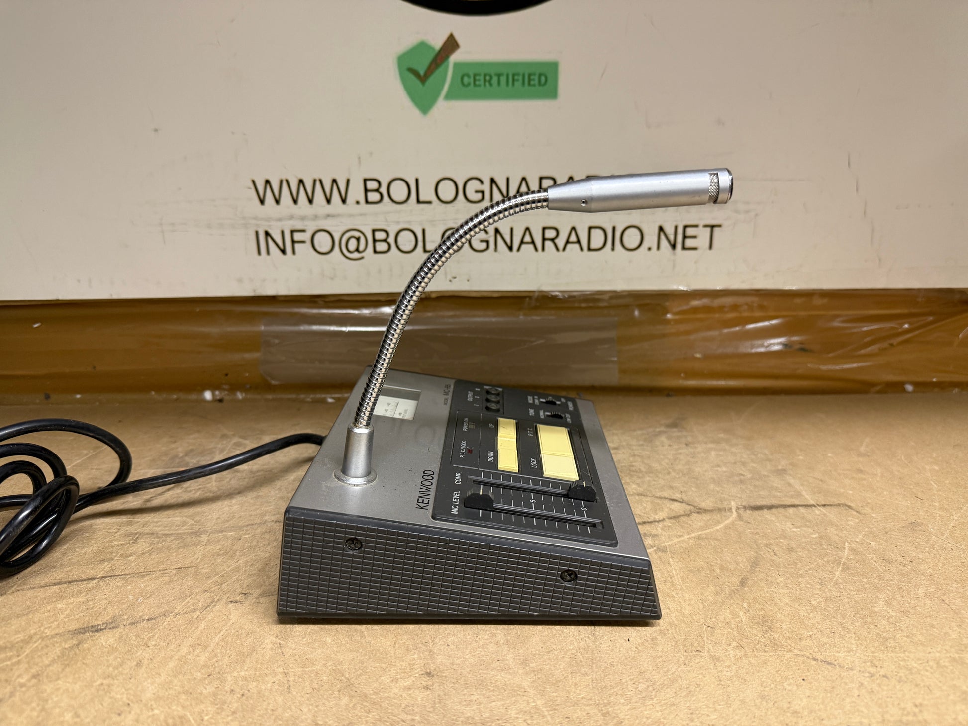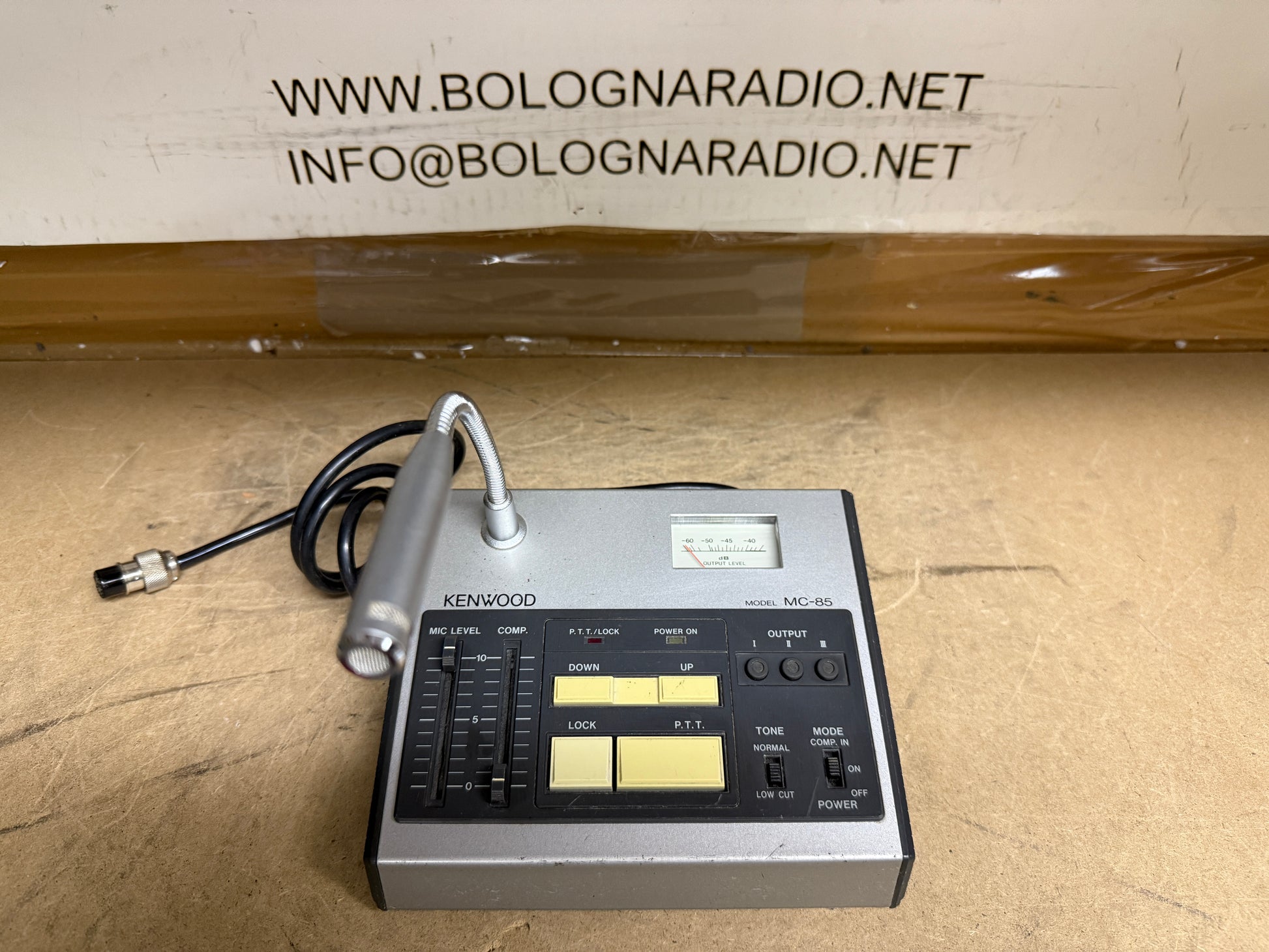 Il Kenwood MC-85 è un microfono da tavolo a condensatore electret unidirezionale. È dotato di accordatura UP-DOWN (sui ricetrasmettitori Kenwood compatibili), compensazione del livello audio integrata, preamplificatore e misuratore di livello. Fornito con un cavo microfonico PG-4G a 8 pin. L'MC-85 può gestire fino a tre ingressi a 8 pin con cavi PG-4F aggiuntivi. Sono disponibili cavi opzionali per radio a 4 pin (PG-4D) e 6 pin (PG-4E). Questo microfono richiede l'alimentazione fornita da alcuni modelli Kenwood. Per altri modelli, è necessario installare quattro batterie AA (non fornite). Questo microfono da 700 ohm ha una risposta da 300 a 7000 Hz.