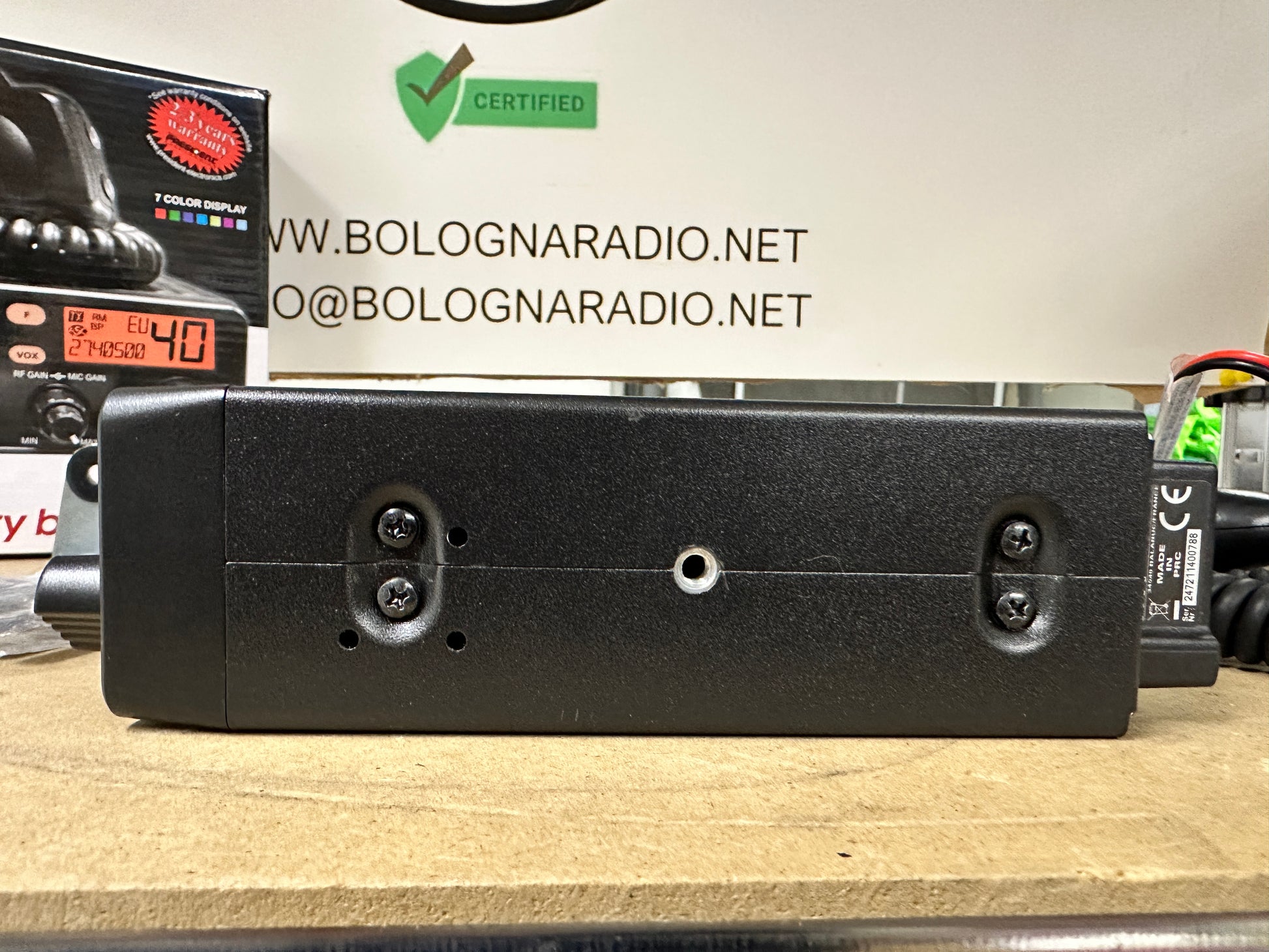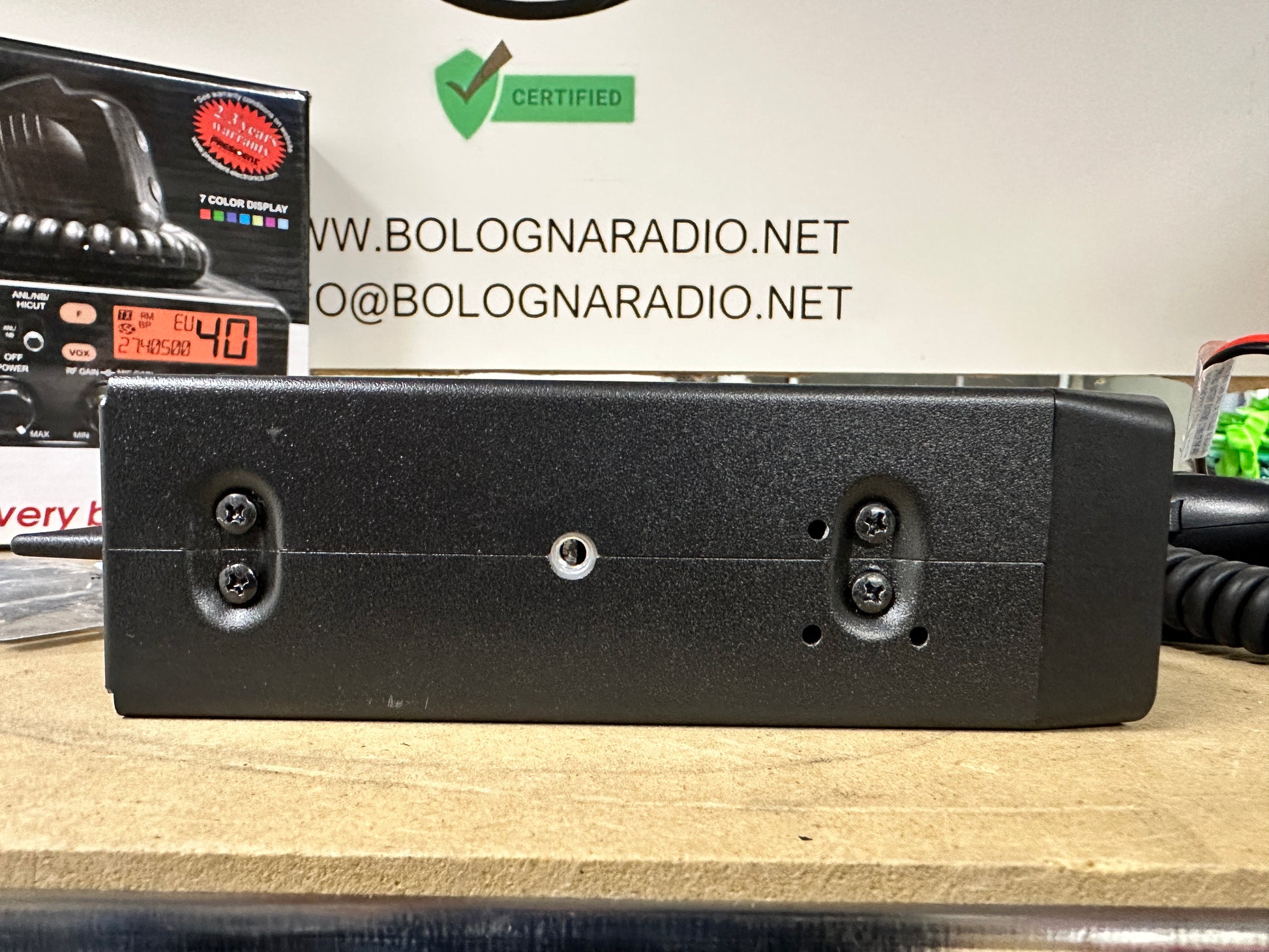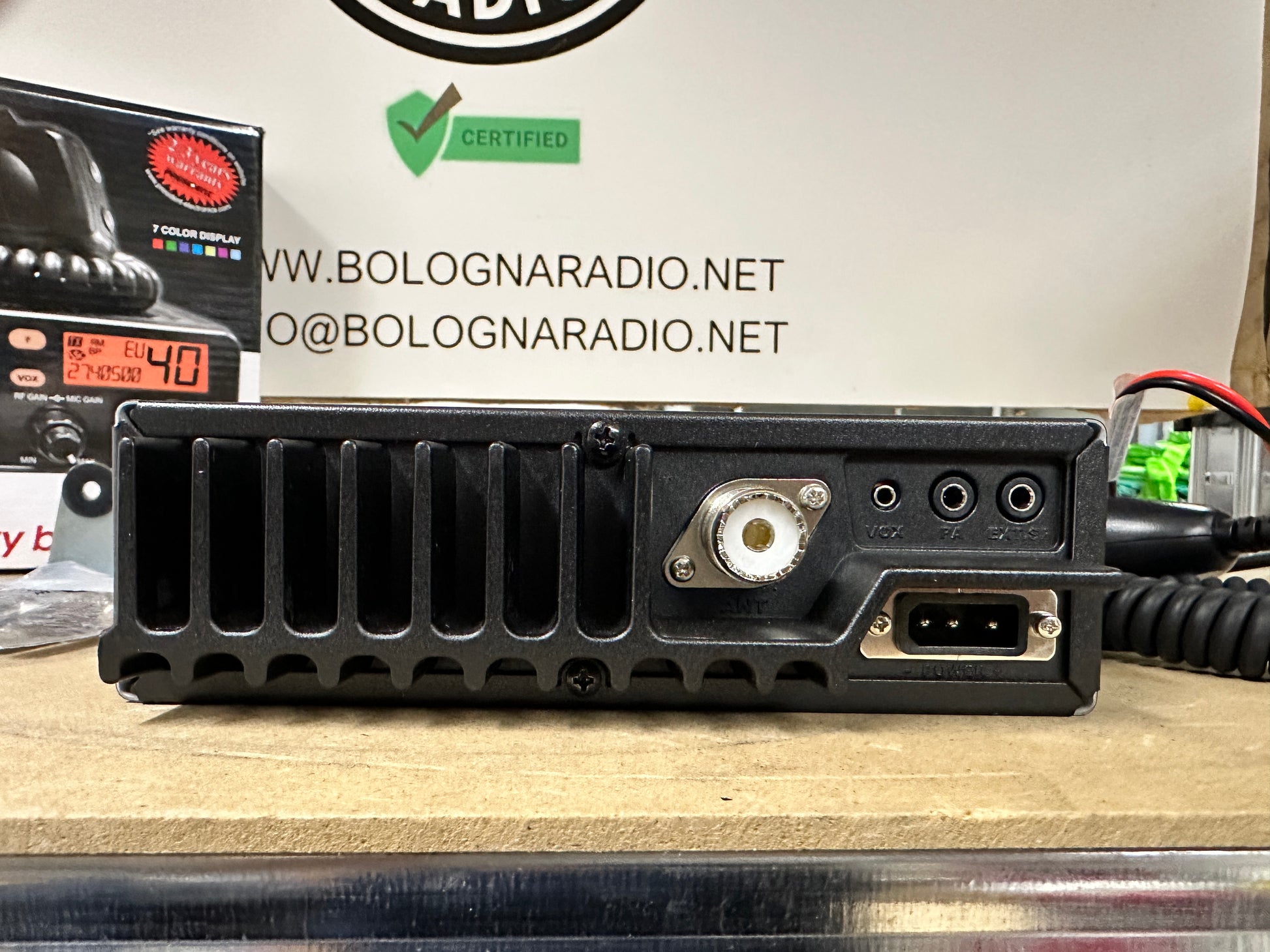 Ricetrasmettitore CB 27 Mhz AM/FM con dimensioni a norme DIN, dotato di smeeter analogico, 3 filtri audio ANL, NB e HI-CUT, roger beep, potenza di uscita regolabile, rosmetro entrocontenuto, display retroilluminato con colori selezionabili dall'utente, frequenzimetro, squelch manuale ed automatico (ASC), presa USB sul frontale