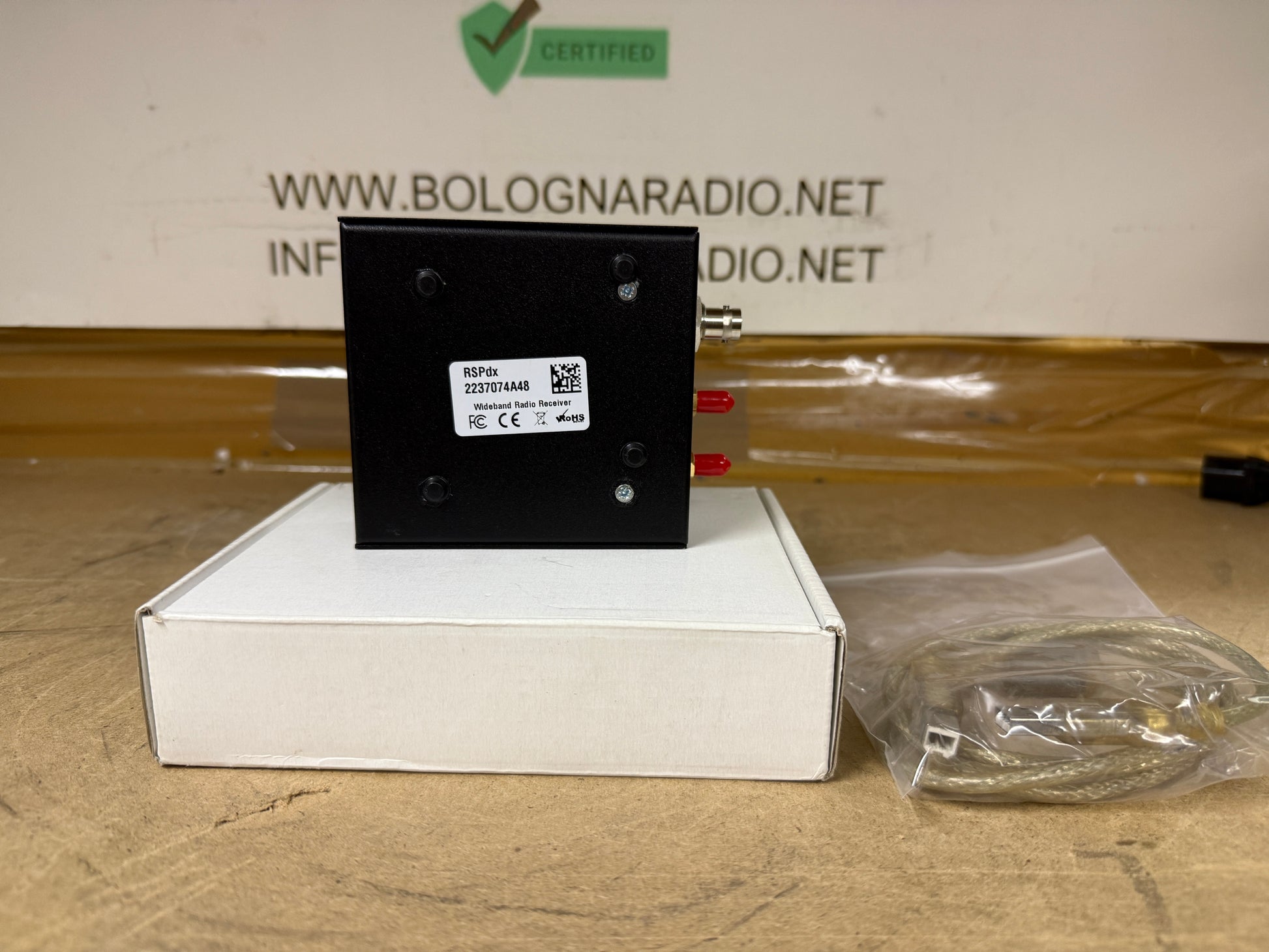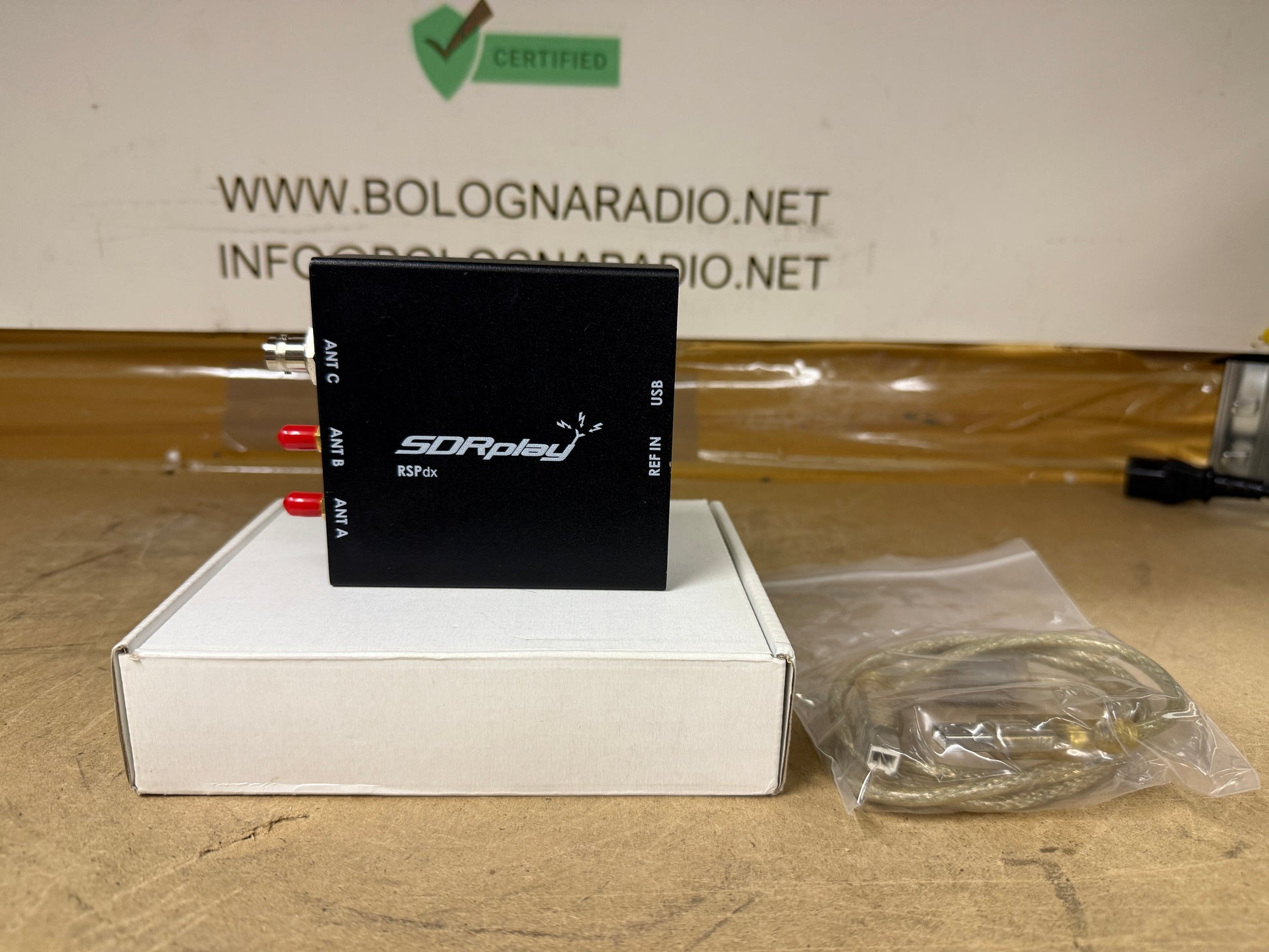 SDRplay RSPdx è un SDR a 14 bit con funzionalità complete a banda larga a sintonizzatore singolo che copre l'intero spettro RF da 1kHz a 2GHz offrendo fino a 10 MHz di visibilità dello spettro. Contiene tre porte per antenna, due delle quali utilizzano connettori SMA e funzionano sull'intera gamma da 1 kHz a 2 GHz e la terza utilizza un connettore BNC che funziona fino a 200 MHz.