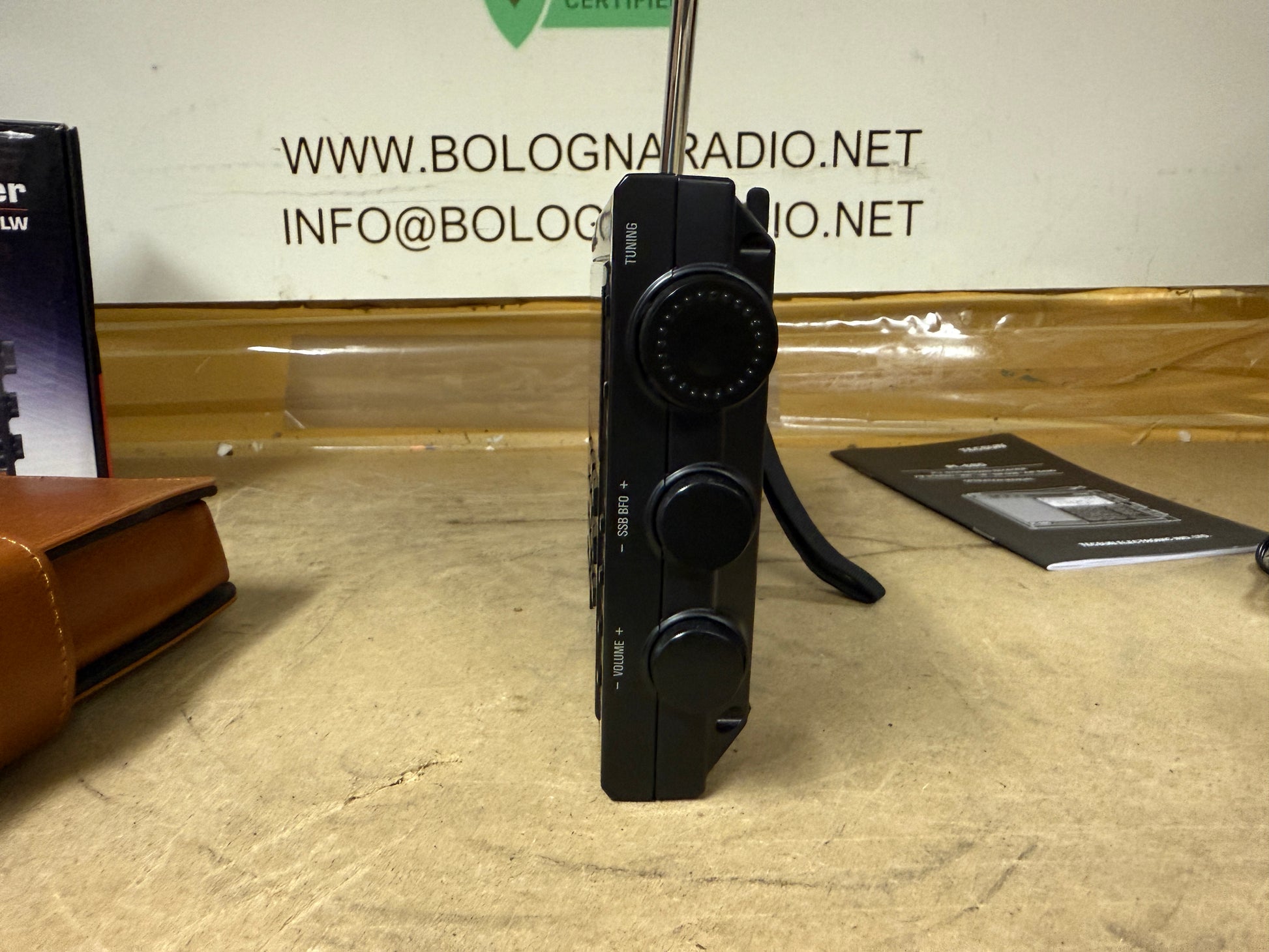 Ricevitore portatile per bande HF/SW (SSB), MW, LW, FM e banda aerea (AM). Doppia conversione per le bande HF/SW, MW e LW. Banda SSB (Single Side Band) con USB e LSB. Rivelatore sincrono con controllo BFO. Antenna telescopica e prese per antenne esterne. 2000 memorie, sintonia a steps di 9K/10K per MW (AM). RF Gain con modalità DX/Normal/Local. 4 modalità di sintonia : ATS (Auto Tuning Storage), scansione automatica con pre-ascolto di 5 secondi, sintonia manuale o inserimento diretto da tastiera. Ampio display LCD e strumento S-Meter digitale. Alimentazione con 4 batterie AA o 6VDC. Caricatore integrato per la ricarica delle batterie. Funzione Sleep Timer (da 1 a 120 minuti) e sveglia con auto spegnimento (da 1 a 90 minuti). In dotazione adattatore 230VAC, custodia in similpelle e antenna a filo per onde corte. (Le batterie stilo ricaricabili non sono incluse !)