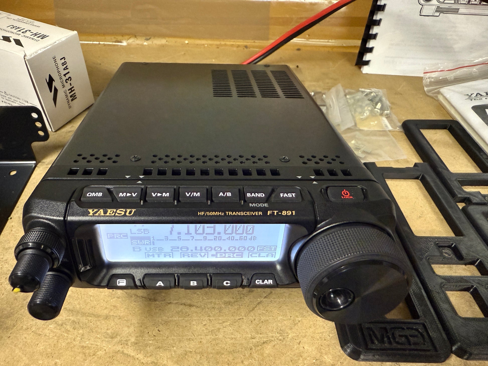 L'FT-891 viene fornito con: MH-31A8J mano microfono, clip microfono, MMB-82 cellulare staffa di montaggio, fusibile di ricambio, manuale, guida di sicurezza e cavo di alimentazione CC. Si richiede 13,8 VDC a 23 Ampere. 6.1 x 2 x 8,6 pollici (155x52x218mm).